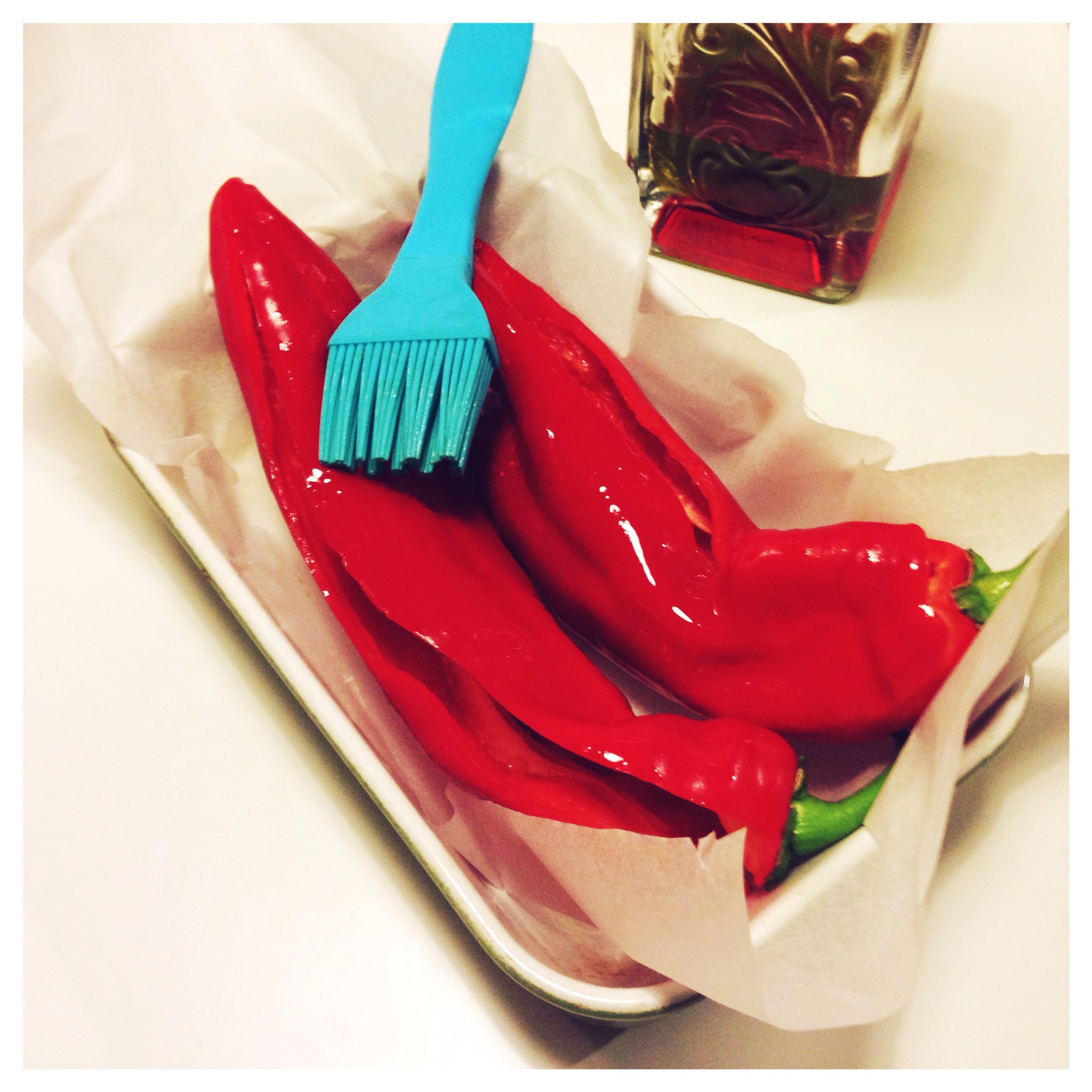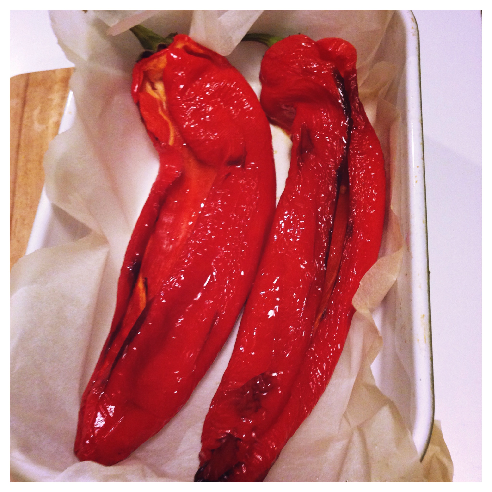 1. Preheat the oven to 200C. Using a sharp knife make a cut along side of the pepper and remove the seeds. Brush your peppers with olive oil in and outside. Place them on a sheet of grease proof paper in an ovenproof dish and roast for 20 minutes.