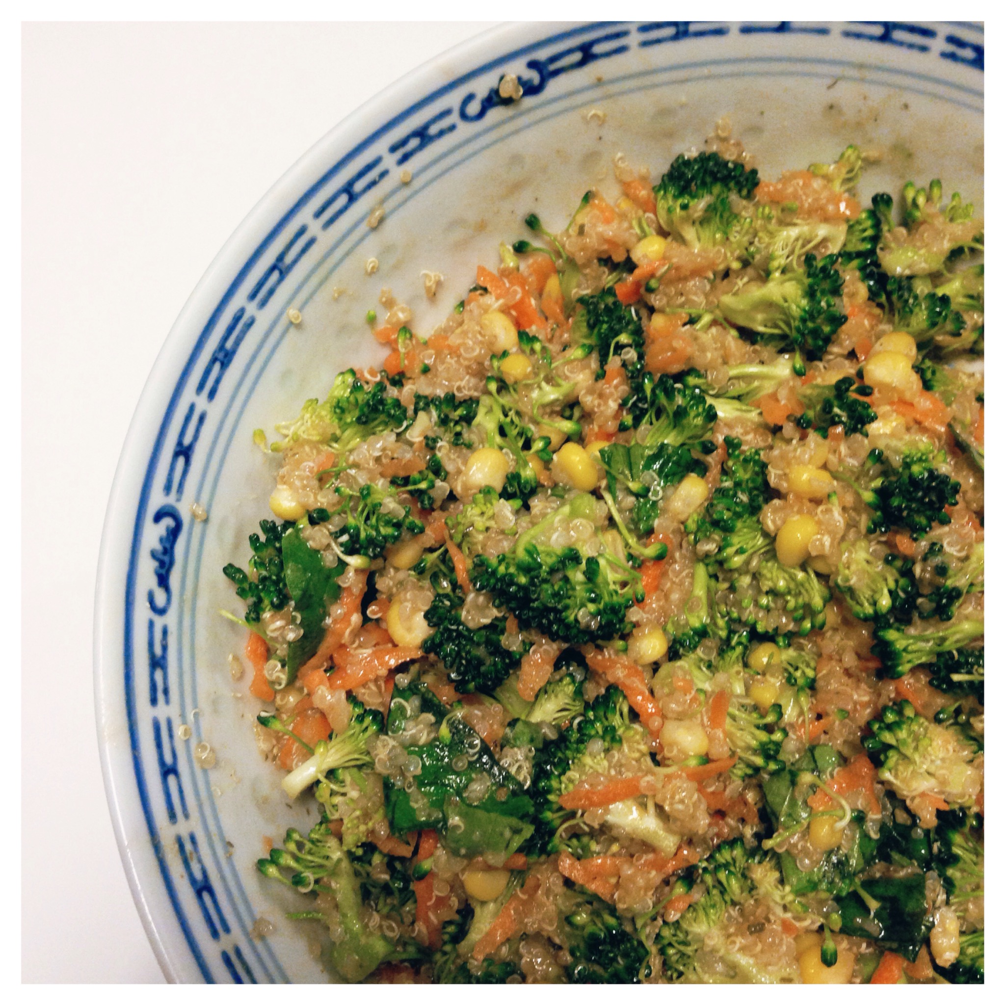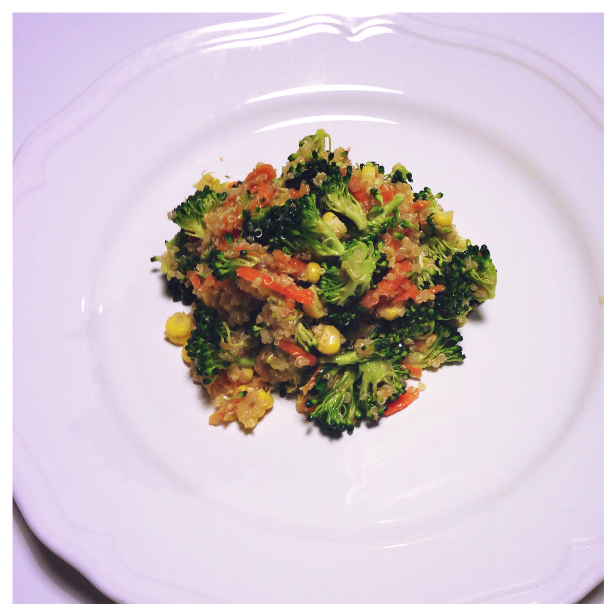1. After quinoa is cooked cool it down and fluff up with a fork. Add broccoli sweetcorn,grated carrots and mix together well.