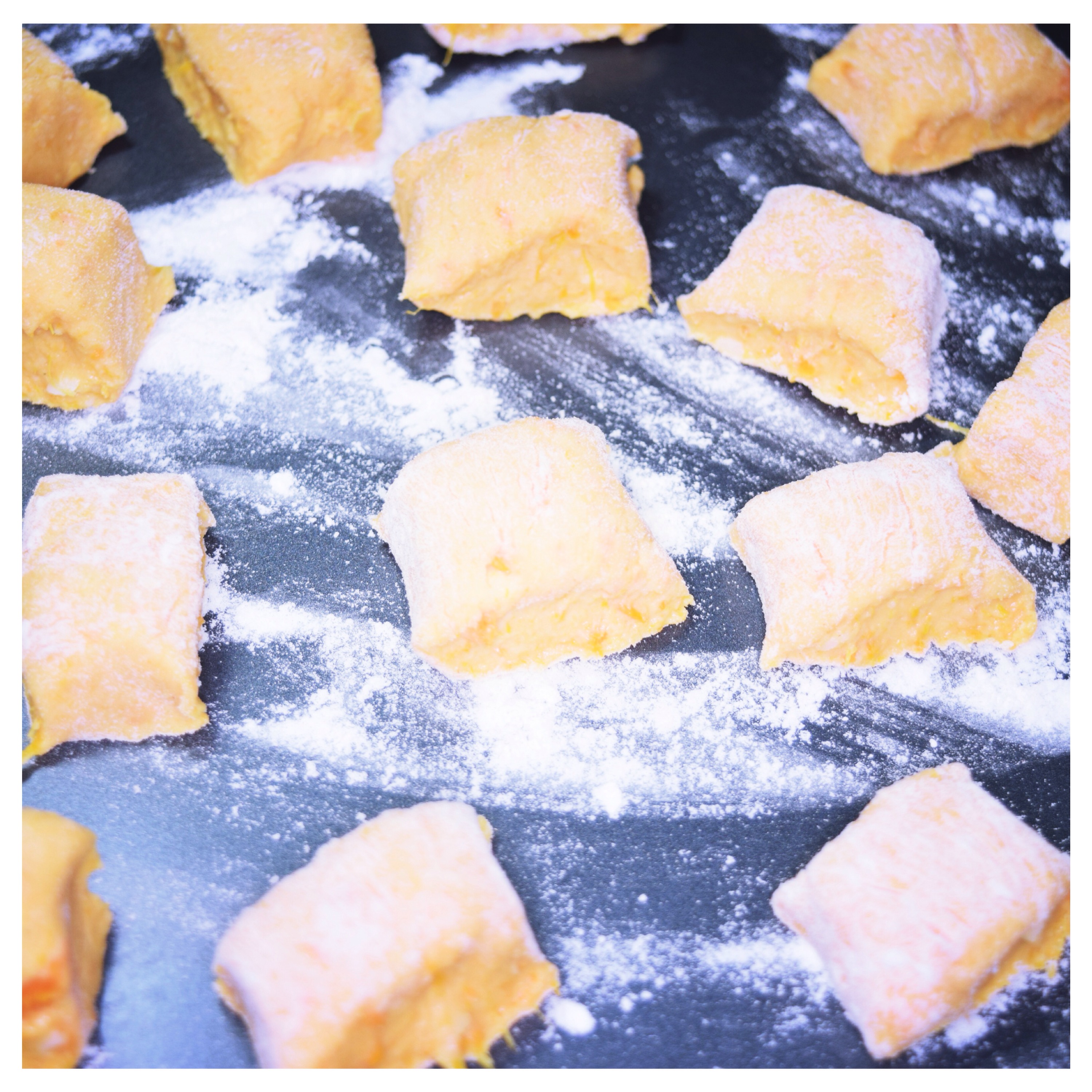 The biggest challenge is the sweet potato itself. The potatoes for gnocchi should be as floury as possible so you don’t have to add too much flour. Unfortunately sweet potato does not have as much starch as his less exotic cousins but I have found a solution to that. Just so the dough bonds a little faster and becomes a little lighter I am adding some corn flour but if you have potato starch it will also do the same trick. Another addition is soft goat’s cheese it is a very important ingredient for two reasons. It really changes the texture of the dumpling adding extra lightness and what is more goats cheese is quite salty so it makes a great flavour addition too.