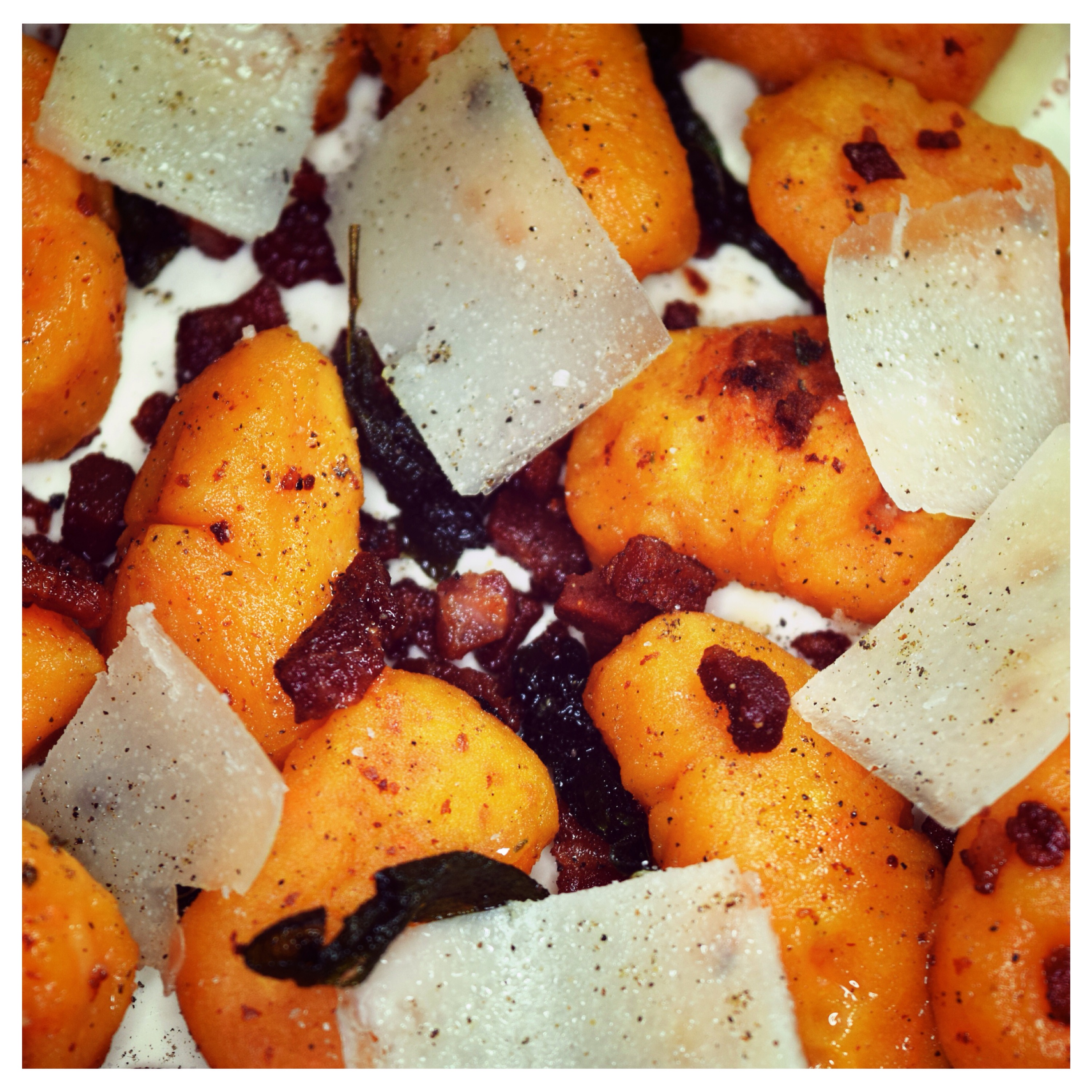 Last but not least important is the choice of what are the little goodies being served with. I have tried many variations like cheese sauce, butternut squash with grapes and pine nuts or simply tomato sauce. My ultimate favourite is crispy diced pancetta with fresh sage and Parmesan shavings. It is absolutely fantastic combination and I really recommend it to everyone if you haven’t tried it yet. The contrast of salty pancetta and Parmesan with pungent taste of sage against the distinctive sweet potato taste of the gnocchi is just perfect! When it comes to textures it is also very complex experience for the tastebuds as you get very crunchy pancetta with lightly crispy gnocchi that are soft in the middle.