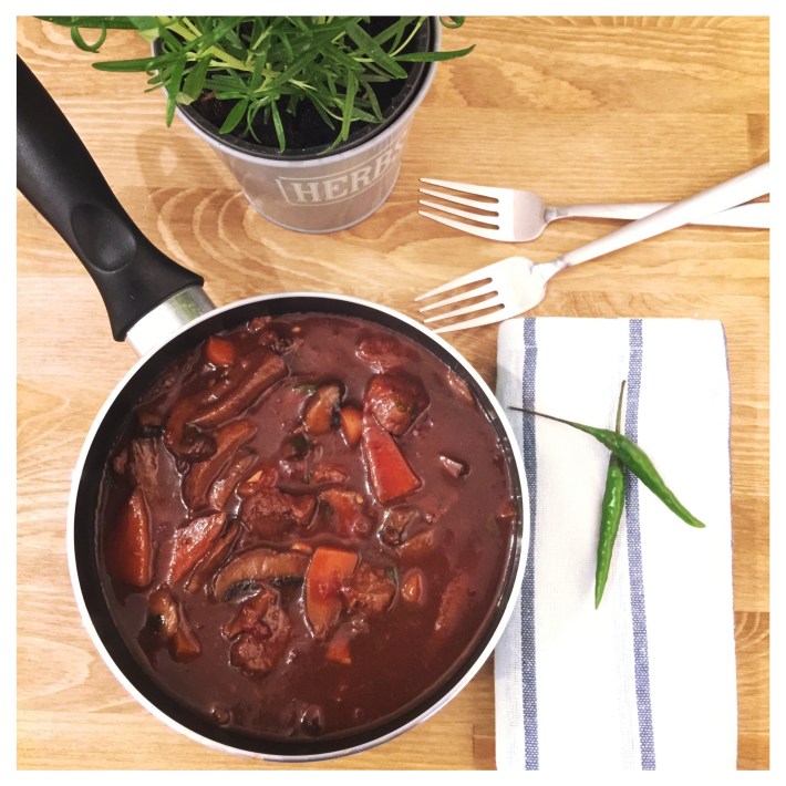 1. Drizzle some olive oil into a non stick pot and fry onions, chillies and garlic until onion becomes soft and slightly transparent then stir in muscavado sugar. Cook for few minutes until it caramelises then add beef and fry until evenly seared