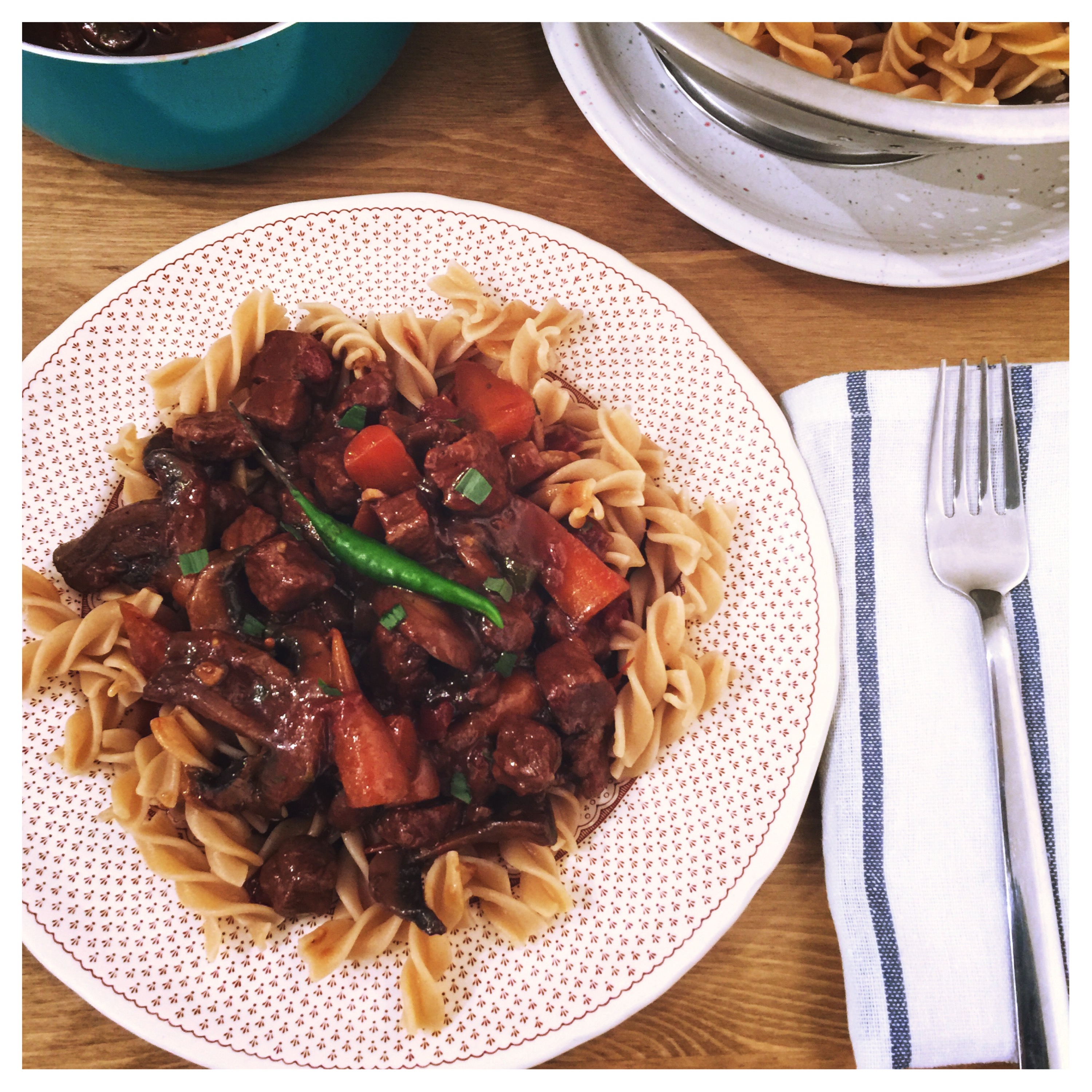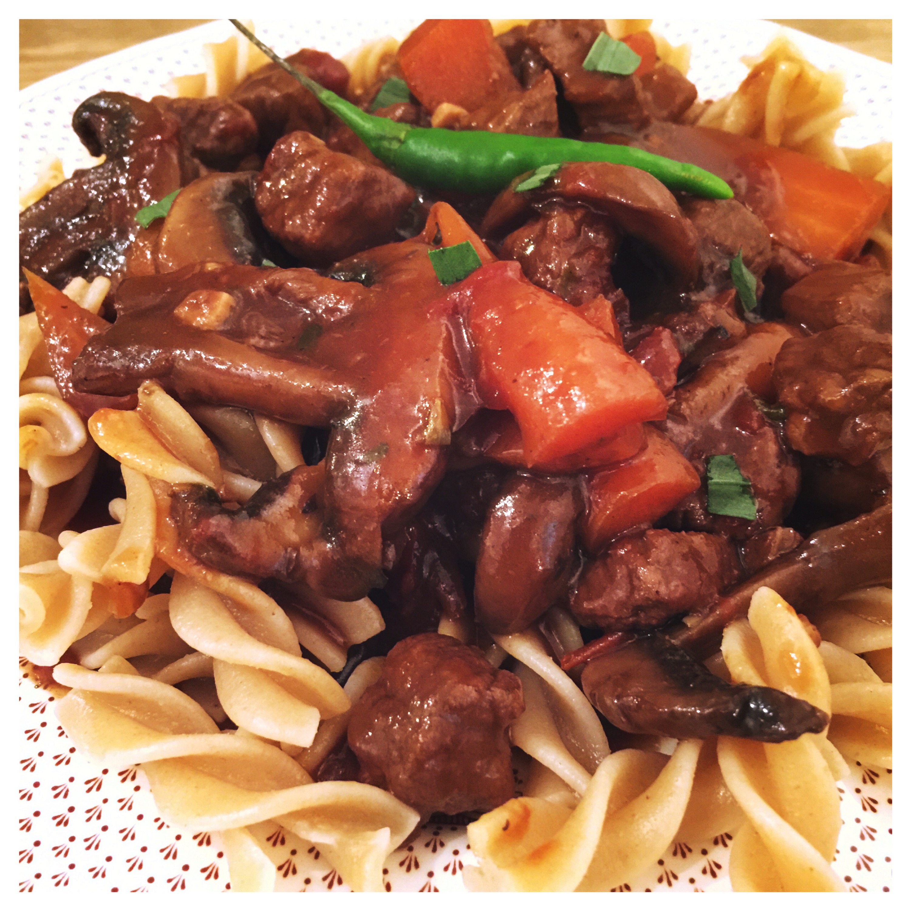 I have tried this dish for the first time in my favourite Italian restaurant in Cardiff called Bellini’s (catchy I know but don’t let the name fool you … It’s really good). So spezzatino is a very rich sauce cooked with steak, tomatoes, onion, mushrooms and carrots with additional kick from green chillies. It’s packed full of meat flavour and it tastes a little bit like beef stew but it’s more acidic because of the tomatoes and a splash of balsamic. Even if you’re a traditional kind of carbonara or bolognese type it’s really worth trying it out.
