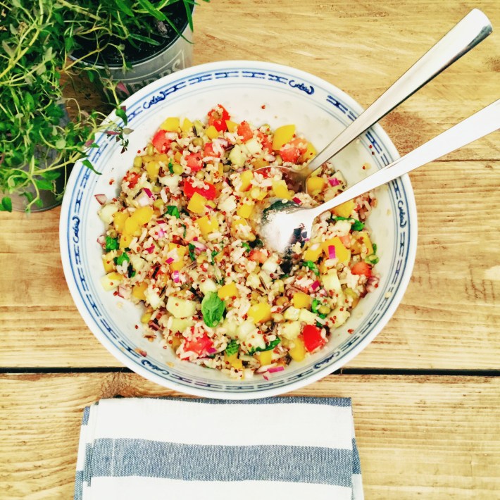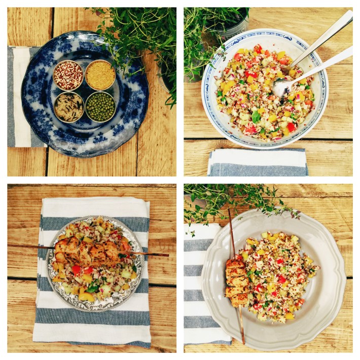 This is a very easy salad that is perfect not only for lunch when you are dieting but also makes a great side dish to any barbecue in the summer. The grains have different cooking time so it’s important you cook them in the order suggested in this recipe. I always cook them in one pot so there is a lot less washing up to do and since all of them will end up in the same salad there is really no point in cooking them separately
