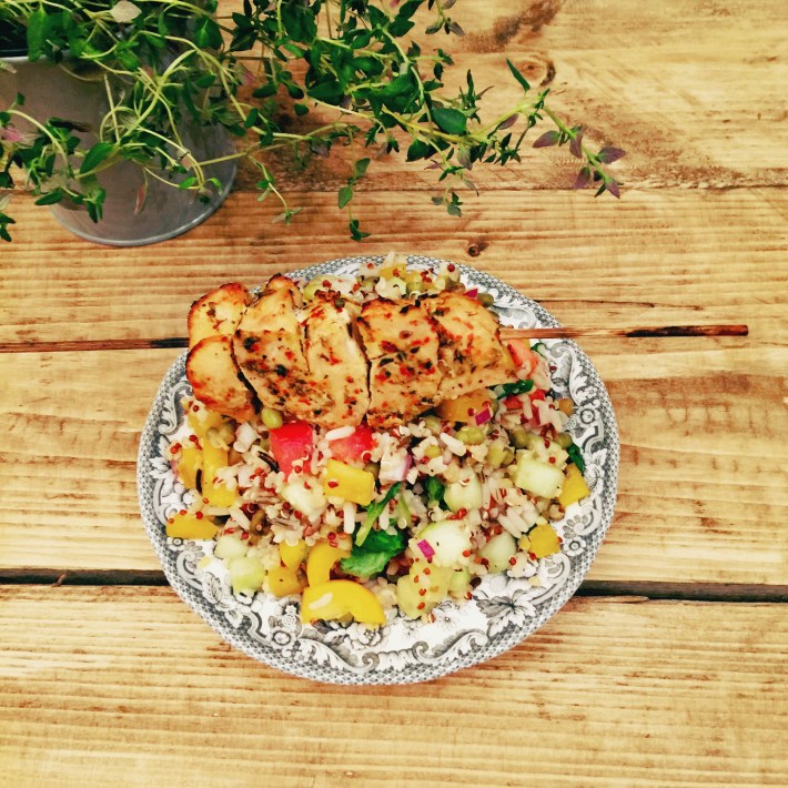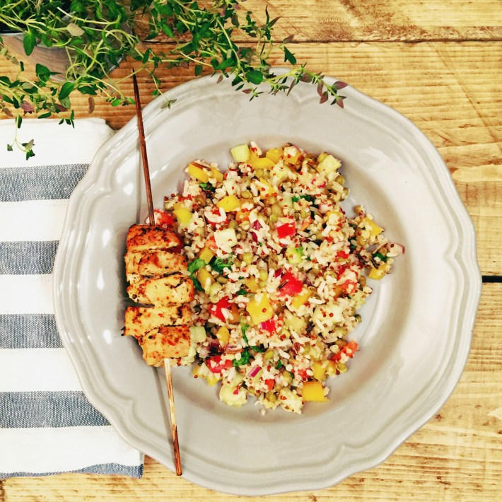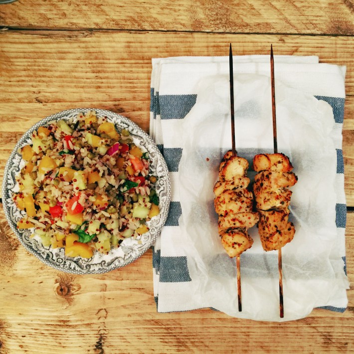 Just to add some extra protein to this nutritious plate, on this occasion I served it with turkey skewers. The meat was marinated for few hours in a marinade made with sesame seed oil, garlic, fresh thyme, dried chilli and lemon juice.
