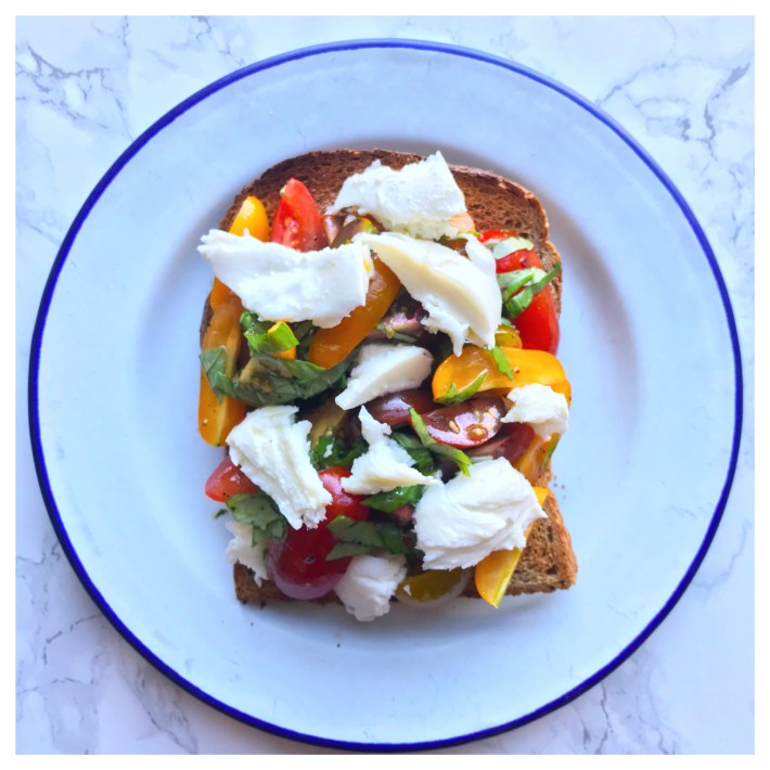 Step 3: Toast the bread and top with the tomato salad, scatter few pieces of mozzarella