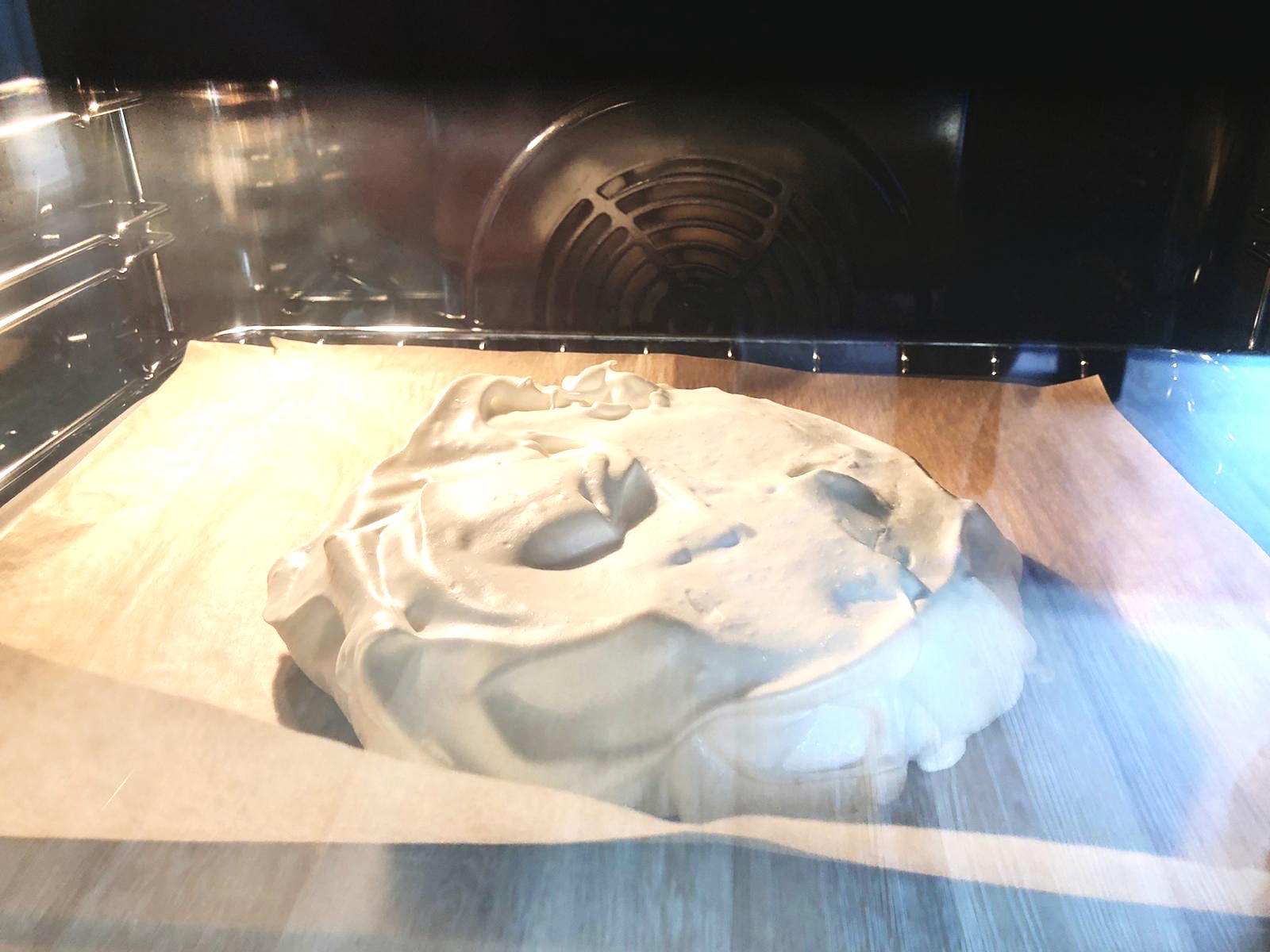 4. Once cool gently peak off the baking paper and place your meringue on the presentation plate.