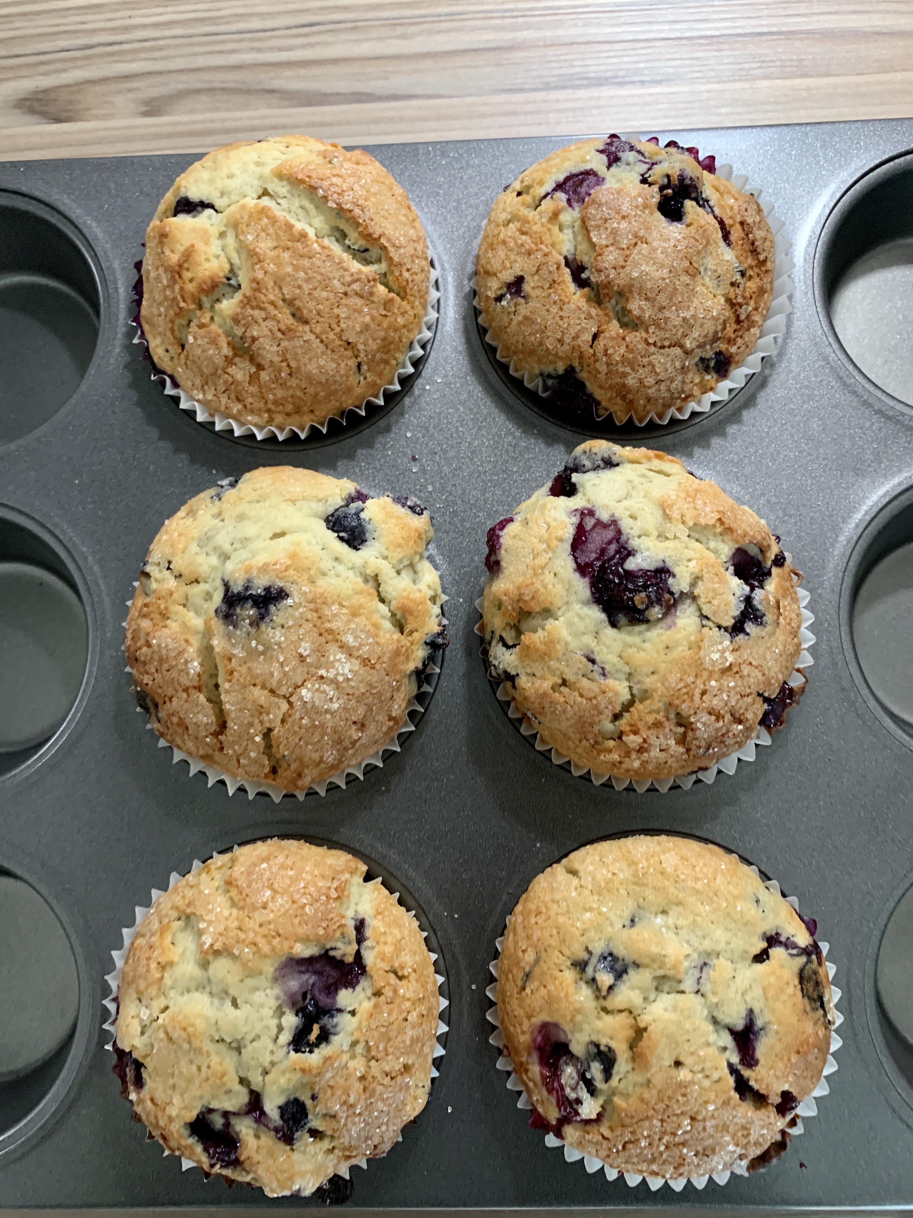 The top secret hack (I will share it with you free of charge )that I have learned from my mum for the blueberries not to drop completely to the bottom of the muffin is to coat them in flour before folding into the batter.